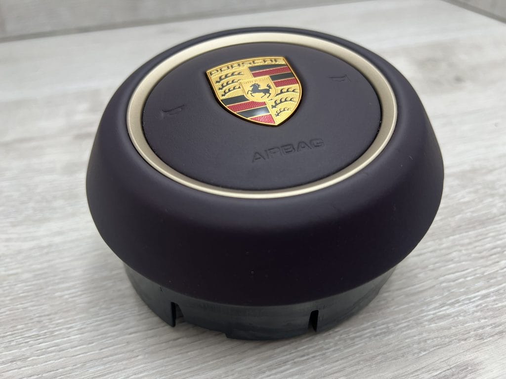 Witam, ogłoszenie dotyczy sprzedaży skórzanej, burgundowej poduszki kierowcy z złotym ringiem do Porsche Macan.