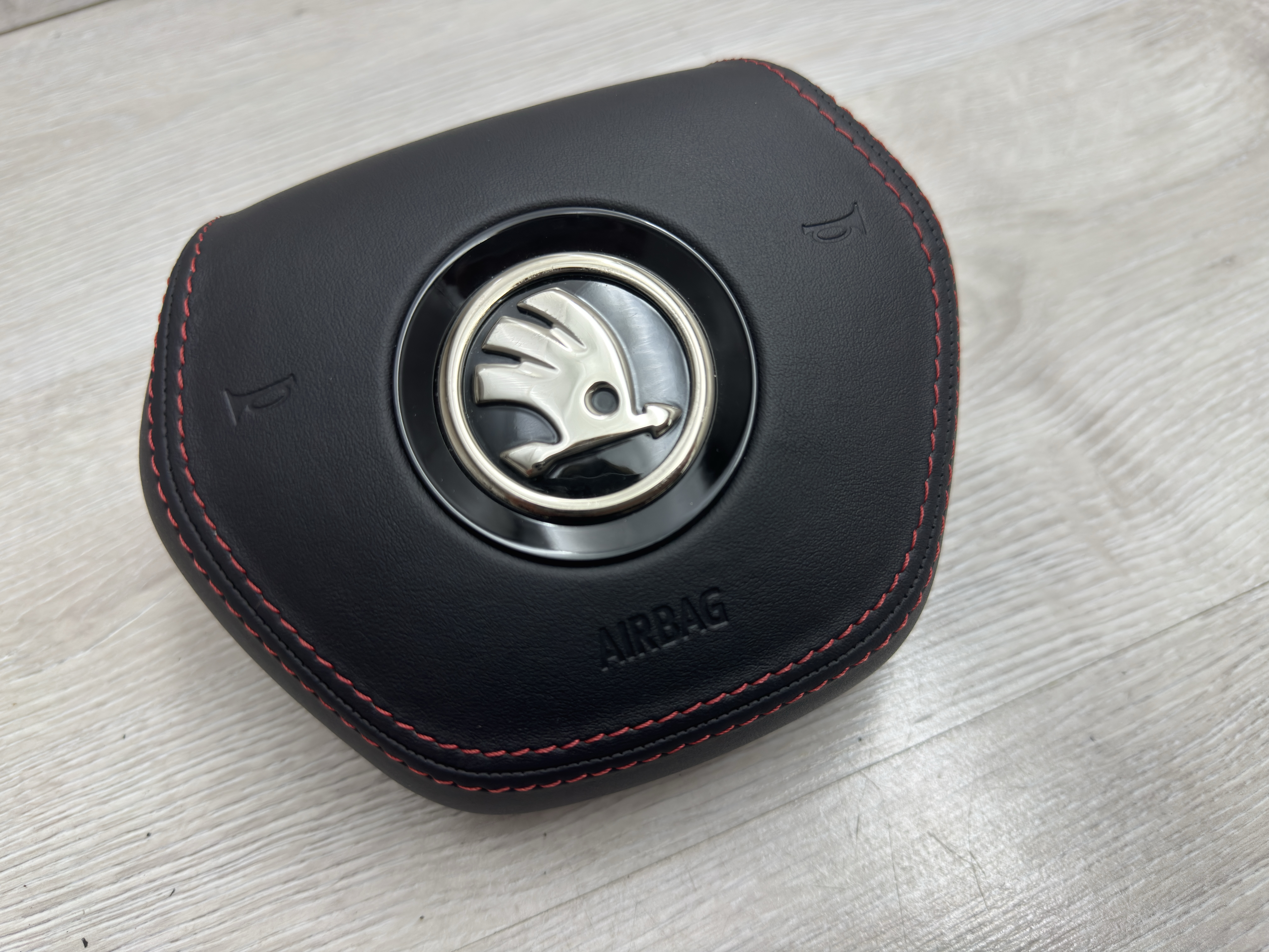 Witam, ogłoszenie dotyczy sprzedaży skórzanej poduszki kierowcy z czerwonymi szwami do Skoda Enyaq.